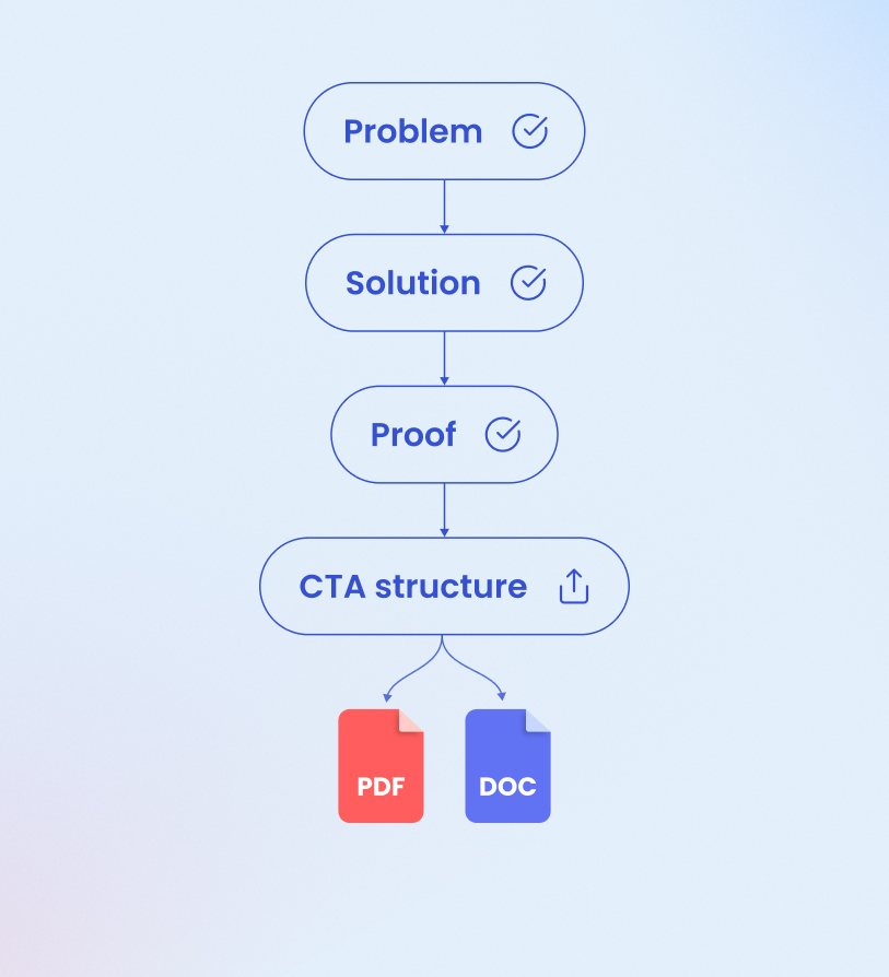 Give the agent a URL, PDF, or internal doc. It extracts the key points, removes duplication, and rebuilds everything into a clear, branded one-pager with a Problem → Solution → Proof → CTA structure, ready to share as a PDF or Doc.