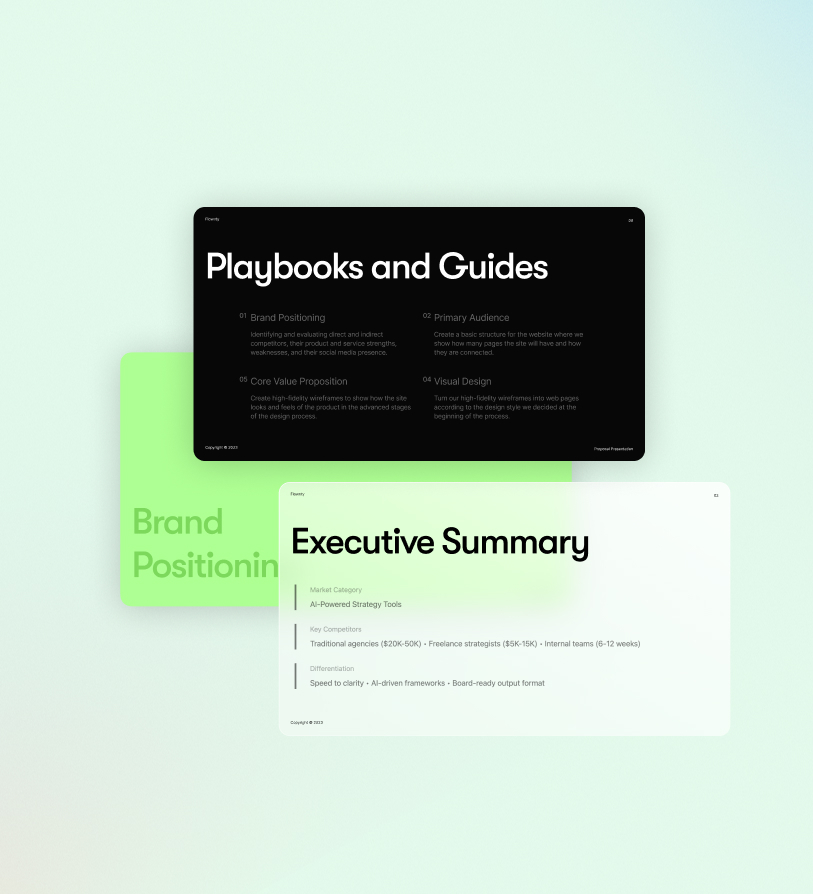 Think: PDF brochures, slide decks, landing-page copy, one-pagers, even LinkedIn notes, all aligned with your brand identity.